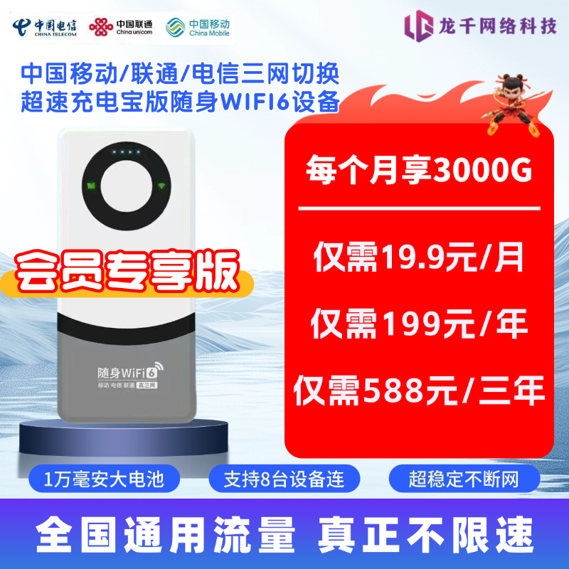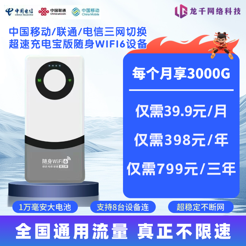 L三网切换随身WiFi—10000毫安版3C认证,可带上飞机设备享质保,随用随充移动/联通/电信三网随意切换10000毫安大电池可持续使用5天左右套餐任选不固定,先买月包,好用再买年包更划算,三种版本设备可供选择(标准版,至尊版,会员专享版)